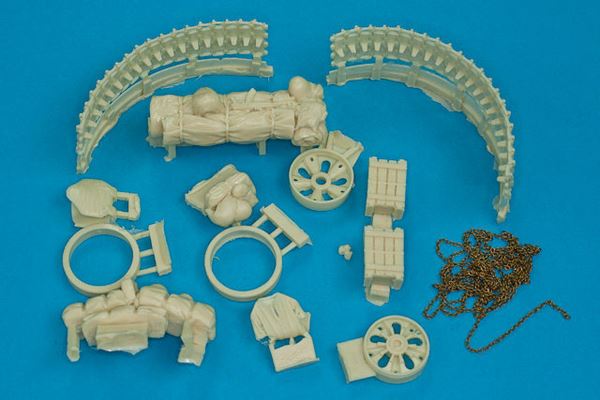 With this set your model will look like T-62 was looking during Afghanistan war, where tracks was mounted around the turret for extra protection. Package contains 12 resin casts and 1 meter of brass chains.
